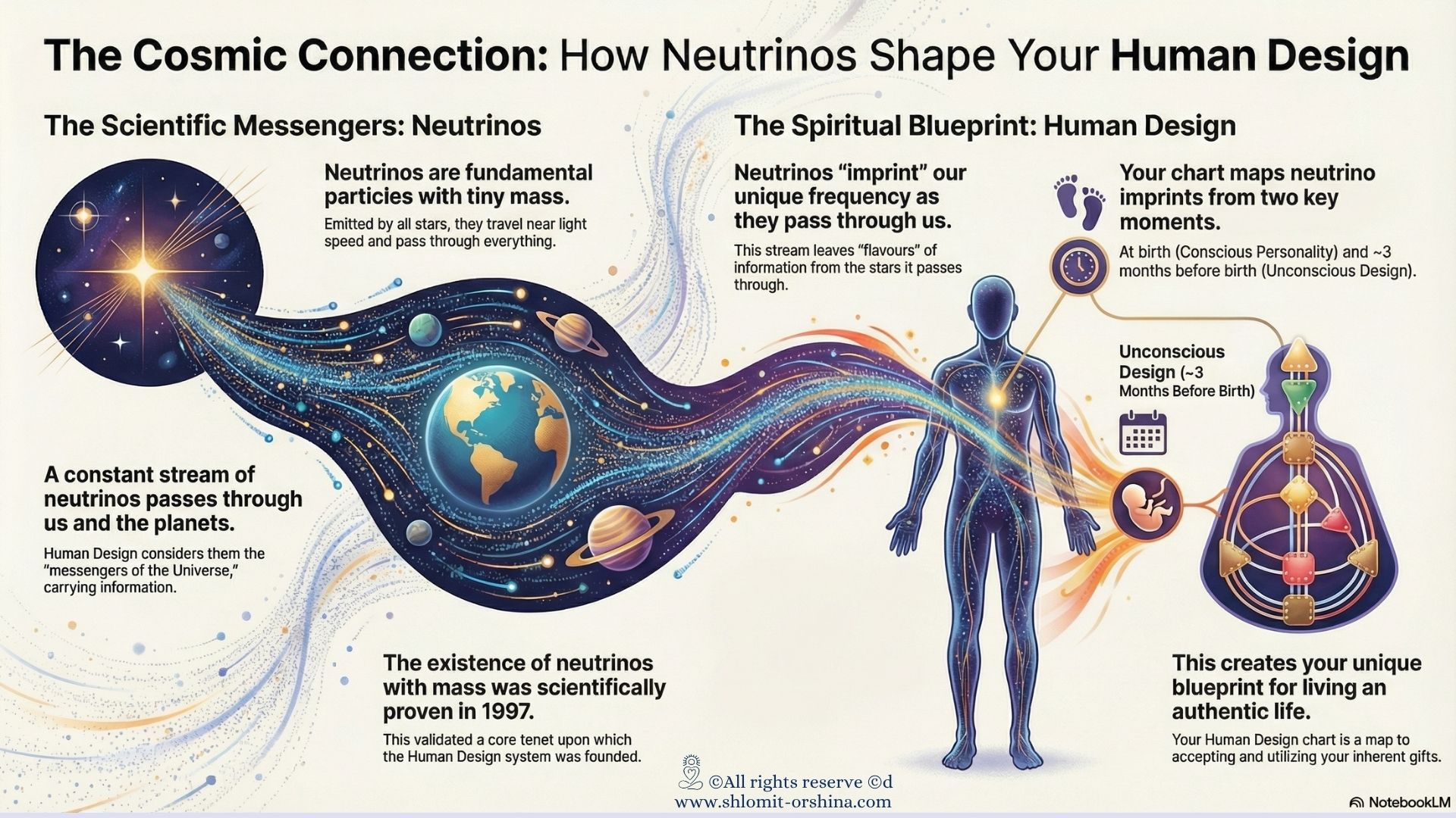 חלקיקי הנייטרינו חודרים דרך כל דבר, וקושרים בין חלקים שונים ביקום. גילויים של הפיזיקאים Takaaki Kajita ו־Arthur B. McDonald שופכים אור על השפעות קוסמיות אלו. Ra Uru Hu, בתיאוריה החדשנית שלו, הרחיב את ההבנה הזו והעמיק את הקשר בין העיצוב האנושי והקוסמוס.המפה האישית בעיצוב האנושי מחושבת לפי תאריך, שעה ומקום הלידה — ומציגה כיצד זרם הנייטרינו “הוטבע” בתוכנו ברגע זה. כל מפה היא ייחודית, וחושפת את המכניקה האישית שלנו בתוך מארג החיים.כך, המפגש עם המפה — הבודיגרף והמפה ההולוגנטית — אינו רק כלי להבנה עצמית, אלא שער לחיבור עמוק יותר: